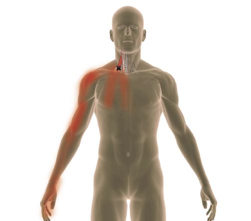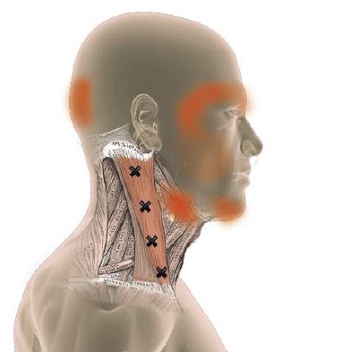 Rasti näyttää lihaksen triggerpisteen ja punainen sen aiheuttaman kipualueen.