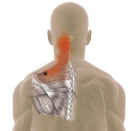 Rasti näyttää lihaksen triggerpisteen ja punainen sen aiheuttaman kipualueen.