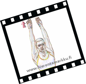 Voit tehdä venytyksen joko seisten tai istuen jalat hieman haara-asennossa. Nosta molemmat kädet ylös kuvan mukaisesti, mutta kuitenkin niin, että venytät toista kättä hieman enemmän kuin toista. Nuoli näyttää venytyksen suunnan. Venytä molempia käsiä kaksi kertaa viiden sekunnin ajan. |
